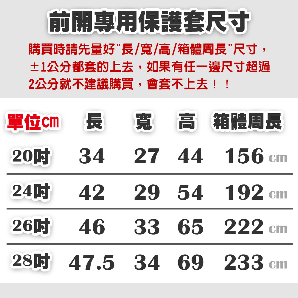 ⚠️請先量您行李箱的"長/寬/高/箱體周長"尺寸,只要±1公分都套的上去,如果有任一邊尺寸超過2公分就不建議購買,會套不上去!!⚠️